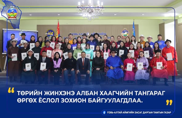Анхдугаар бичмэл Үндсэн хуулийг баталж, Бүгд Найрамдах Улсаа тунхагласан 101 жилийн ойг тохиолдуулан өнөөдөр Төрийн албаны Говь-Алтай аймаг дахь салбар зөвлөлөөс “Төрийн жинхэнэ албан хаагчийн тангараг өргөх ёслол”-ыг зохион байгууллаа.